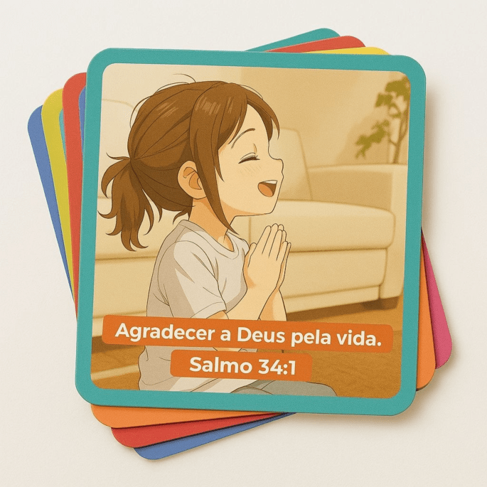 30 cartões ilustrados com versículos e pedidos de oração pensados para crianças. A ideia é tirar um cartão por dia e orar juntos, tornando a oração um momento especial entre mãe e filho.