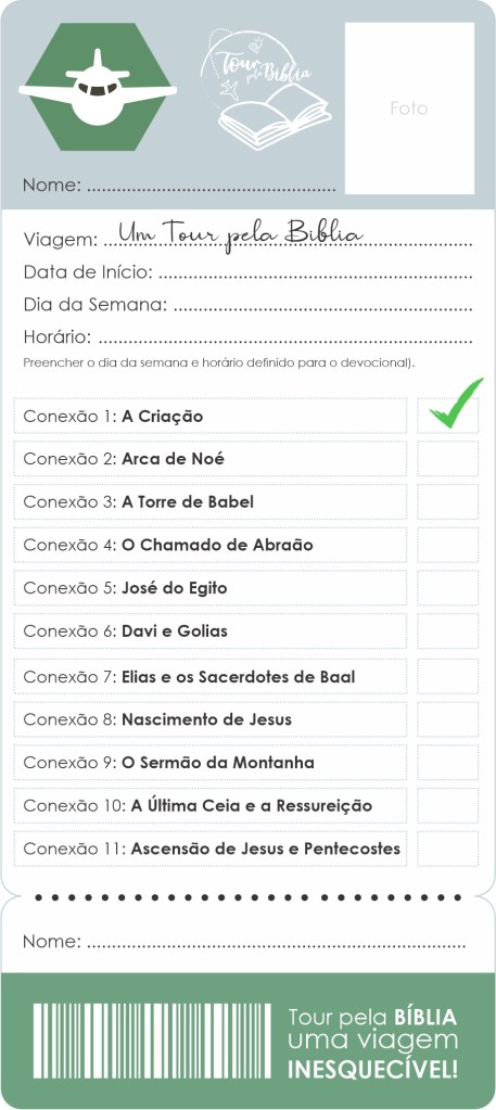 Logo no início do material, você encontrará um cartão de embarque, que pode ser preenchido conforme a criança avança nas atividades devocionais. Isso torna a experiência ainda mais envolvente e divertida.