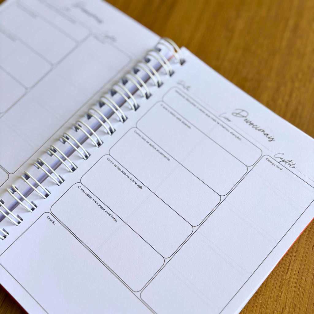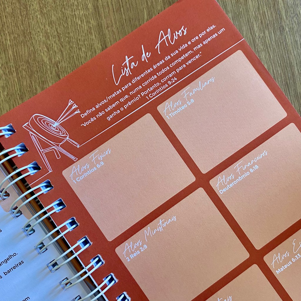 O journal contém campos para você definir metas, planejamento de livros, planos de leitura e guia de oração.